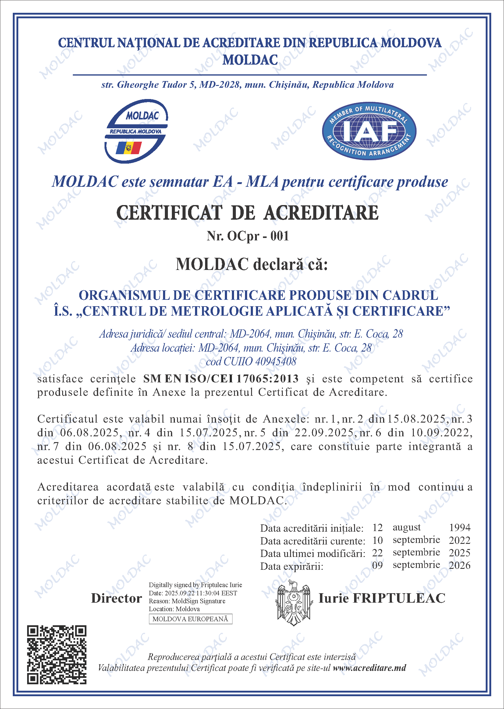 Subdiviziune structurală în cadrul Î.S. „CMAC”, cu subordonare directă directorului întreprinderii, Organismul de Certificare Produse (în continuare OCpr) este acreditat și supravegheat de Centrul Național de Acreditare MOLDAC al Republicii Moldova – certificat de acreditare nr. OCpr-001, valabil până la 09.09.2026.