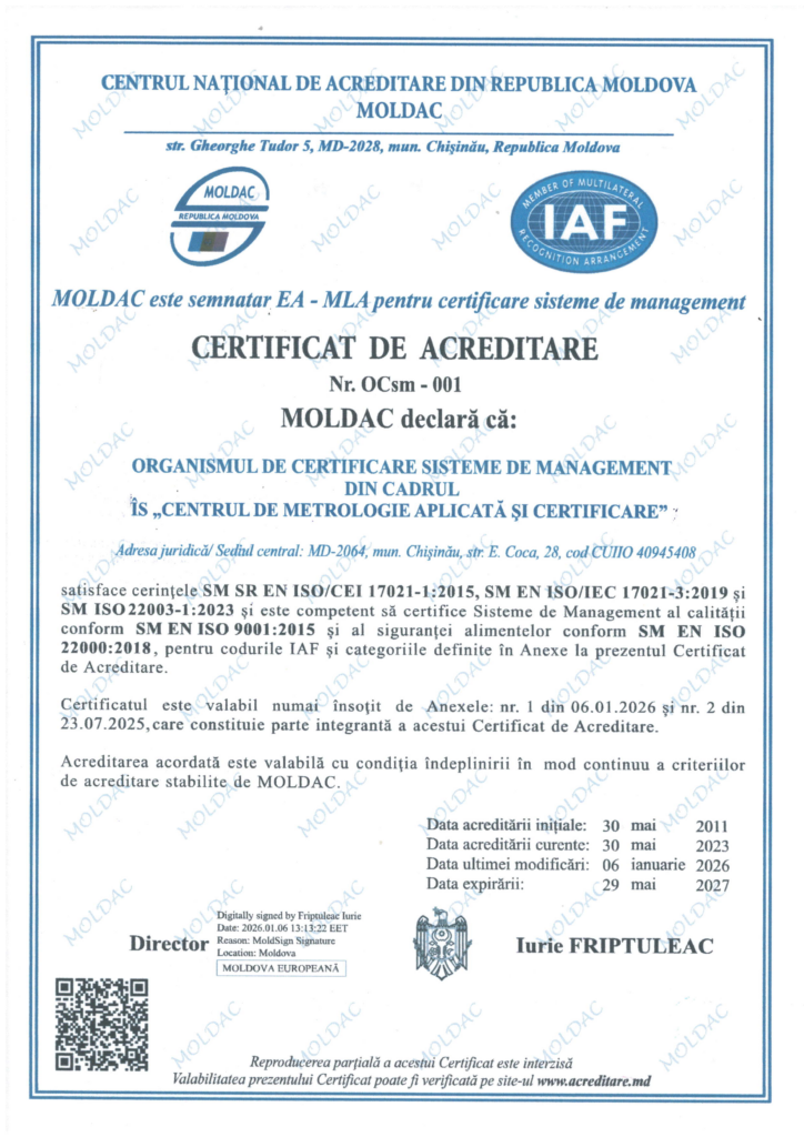 Subdiviziune structurală în cadrul Î.S. „CMAC”, Organismul de Certificare Sisteme de Management (în continuare OCSM) este acreditat și supravegheat de Centrul Național de Acreditare MOLDAC al Republicii Moldova – certificat de acreditare nr. OCpr-001 din 06.01.2026.