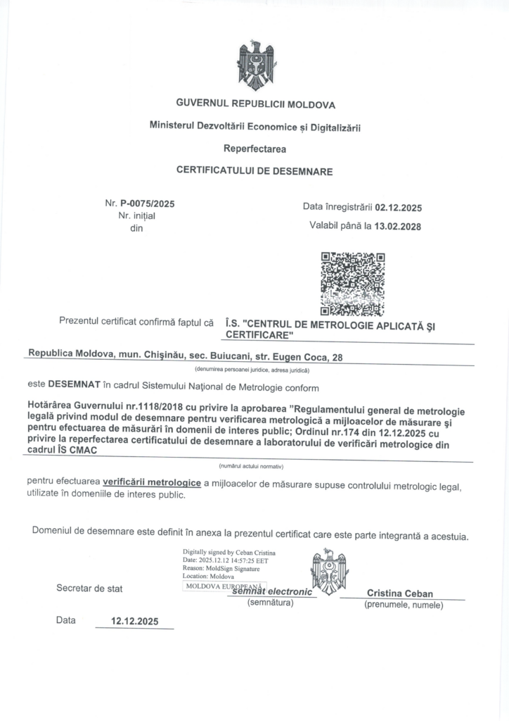 Laboratorul de Verificări Metrologice (organism de inspecție de tip A) din cadrul întreprinderii este desemnat în Sistemul Național de Metrologie pentru efectuarea verificărilor metrologice ale mijloacelor de măsurare utilizate în domenii de interes public (Certificat de desemnare nr. P-0075/2025).